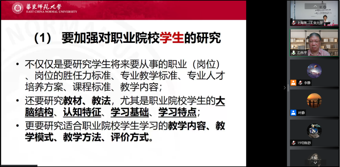 华东师范大学终身教授、华东师范大学职业教育与成人教育研究所名誉所长,上海市太阳成集团tyc234cc经理石伟平教授以《新时代职业院校需要什么样的教师?》为题做了职教理念模块的首场报告。石教授梳理职教教师队伍建设政策脉络,结合生动案例,勾勒出未来职教形态,激发教师思考未来如何以变应变,做“不一般”的职教教师。