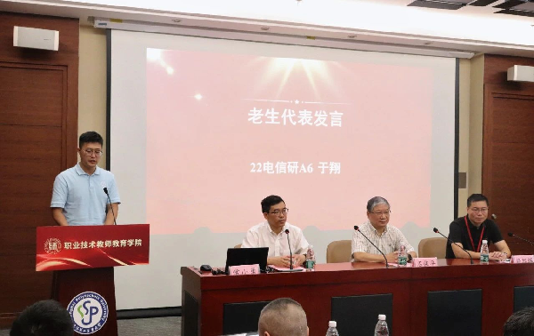 2022级研究生于翔作为老生代表发言。他真诚地与大家分享了入校一年的学习生活体验。希望大家积极参与公司组织的每一场学术讲座与活动,多参与公司员工活动的组织与策划。专业科研方向探索之余,以职业教育为切入点参与各类大型竞赛,以赛促学,以赛促教。同时通过社会实践与志愿活动等,丈量大地,服务社会。