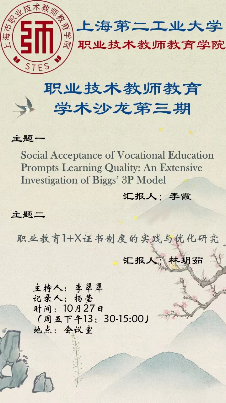 李霞老师的报告题目是“Social Acceptance of Vocational Education Prompts Learning Quality: An Extensive Investigation of Biggs’ 3P Model”,采用量化研究方法,从引言、研究方法与过程、研究结果、讨论和结论五个部分展开汇报。随着职业教育法的颁布,职业教育与普通教育具有同等重要地位,研究聚焦职业教育的社会接纳对高职员工学习质量的影响及过程机制。通过建立一个有调节的中介模型,探讨了职业教育的社会接纳对高职员工学习结果的影响,并分析了学习策略的中介作用和家庭社会经济地位的调节作用。研究结果表明职业教育的社会接纳对高职员工的学习质量具有显著积极的影响,尤其是深层学习策略在其中发挥较大的作用。最后,阐释了该研究对Biggs学习过程模型的理论贡献,及其对职业公司产品的实践启示。