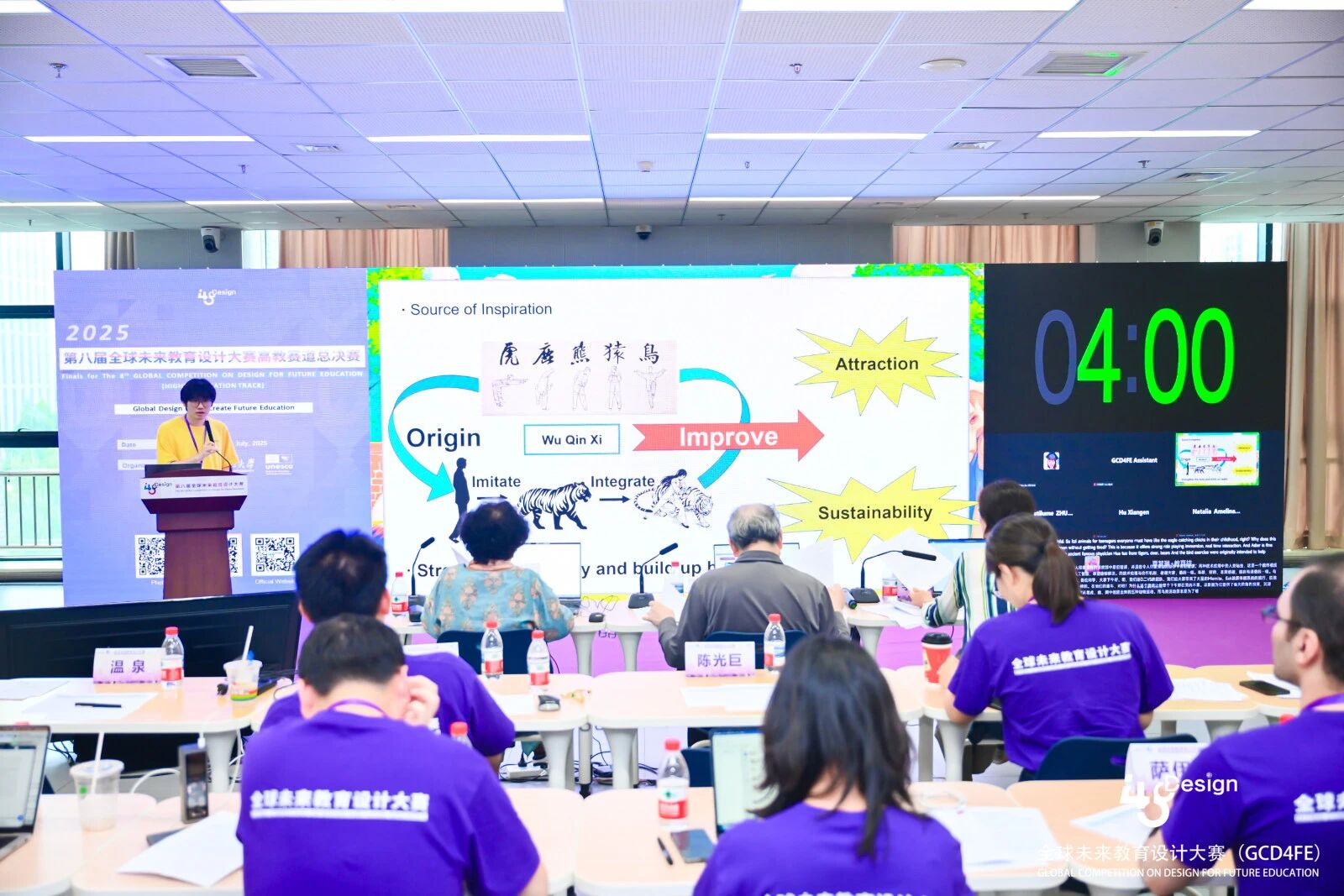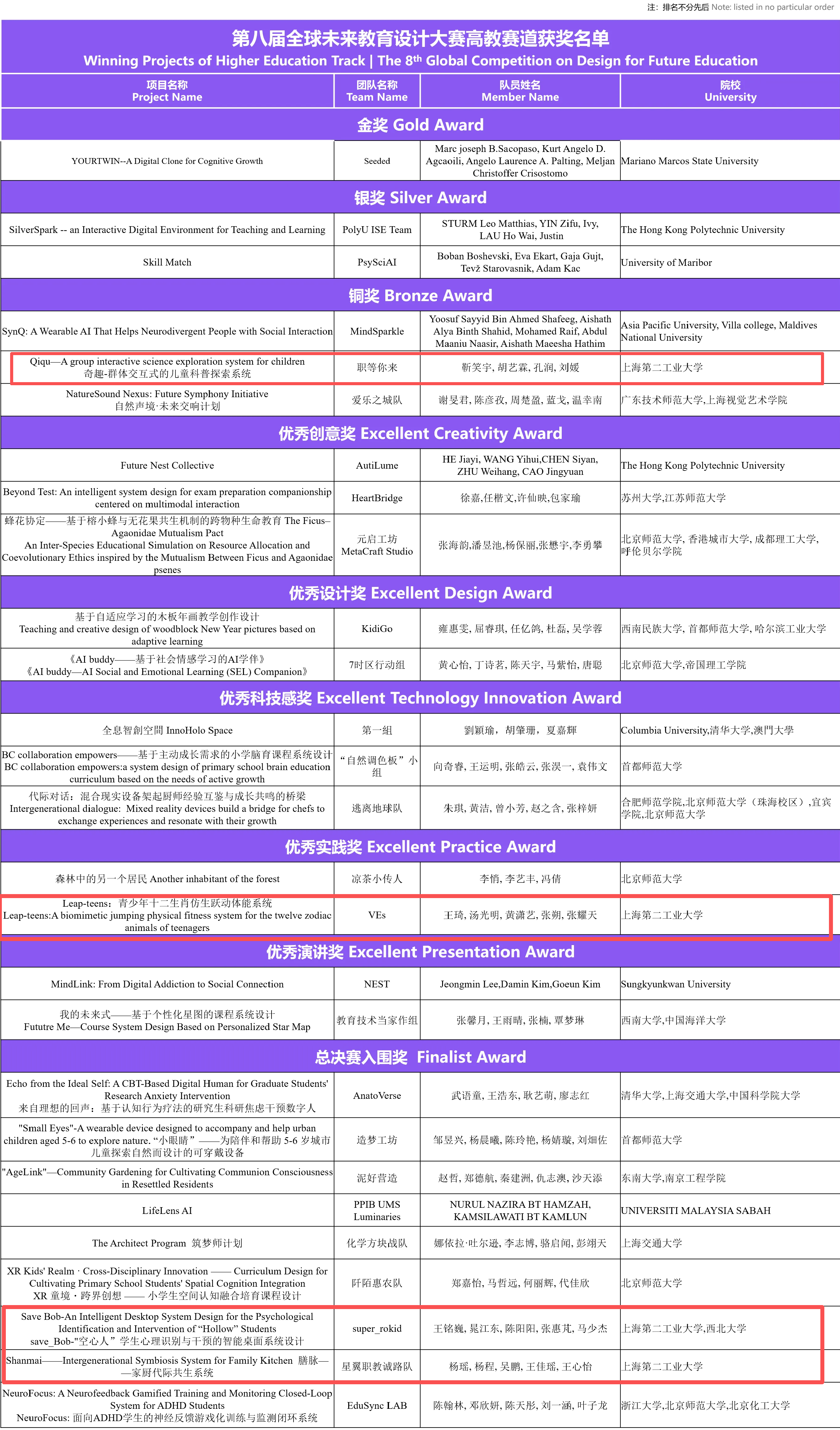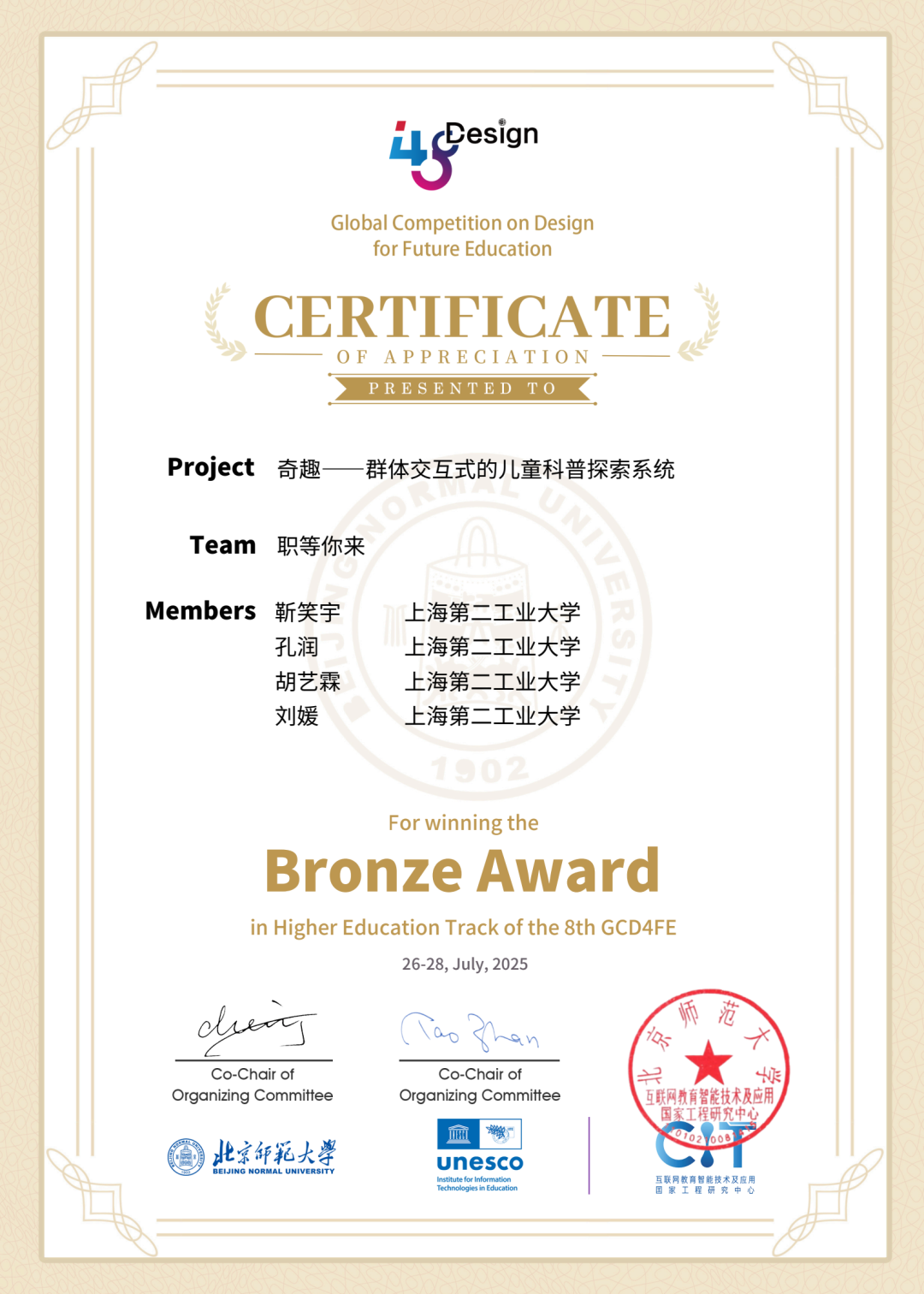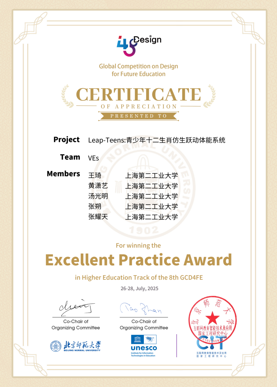 靳笑宇、孔润、刘媛、胡艺霖组成的“职等你来”团队凭借作品《奇趣-群体交互式的儿童科普探索系统》,以全球第五名的成绩斩获铜奖,位列中国参赛队伍第一名。该作品聚焦“以人为本的AI设计(人与机器共生)”主题,以协作知识建构理论为支撑,借助AI技术打造具身认知场景与群体协作学习模式,助力低龄儿童掌握科学知识、培育核心素养,独特视觉效果获评委高度认可。王琦、黄潇艺、汤光明、张朔、张耀天组成的“VEs”团队围绕“大自然中的跨物种学习设计(人与自然共生)”主题,设计《Leap-Teens:青少年十二生肖仿生跃动体能系统》,将五禽戏、形意十二形拳等传统功法进行现代化转译,为青少年体质提升与心智发展提供方案,获得优秀实践奖。